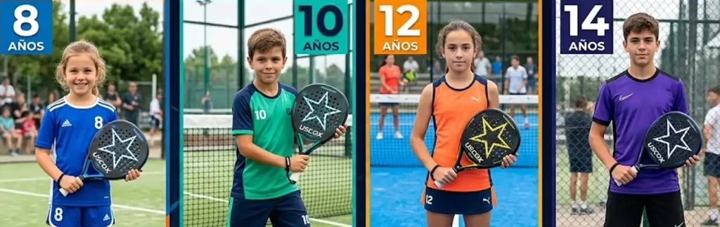 Para chicos y adolescentes menores de 14 años, el factor más importante es el peso. Una paleta de adulto (355-370g) es demasiado pesada para un menor en crecimiento y puede causar molestias en muñeca, codo y hombro.